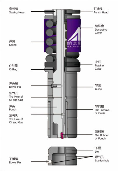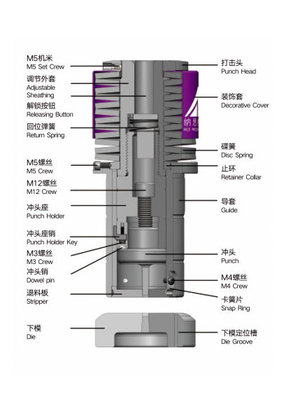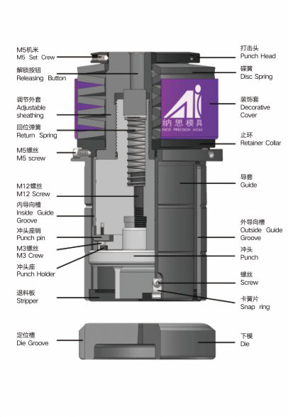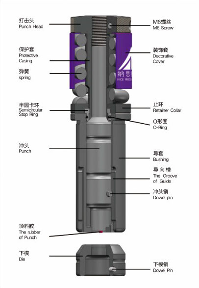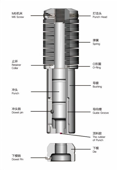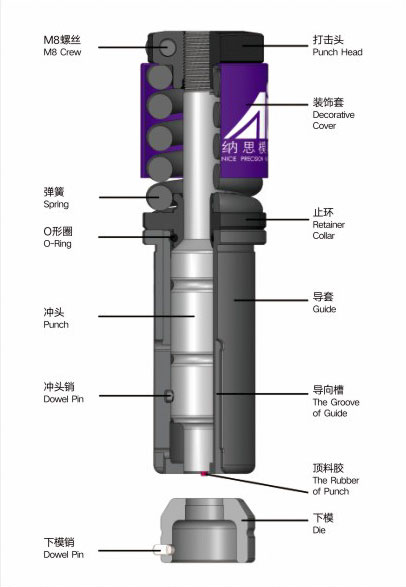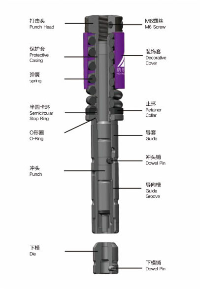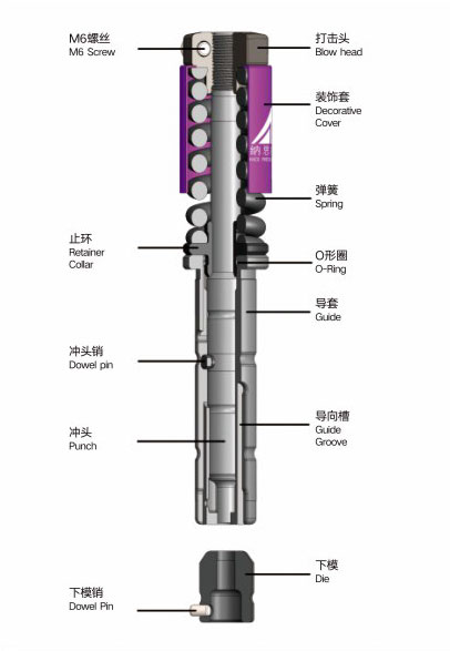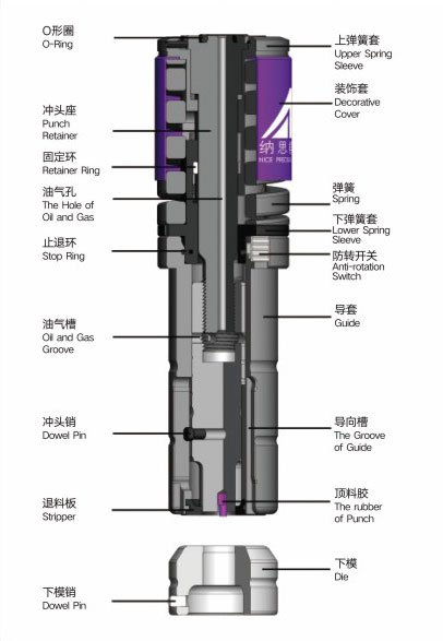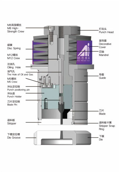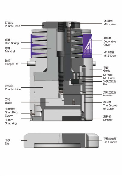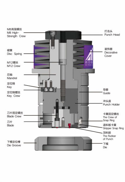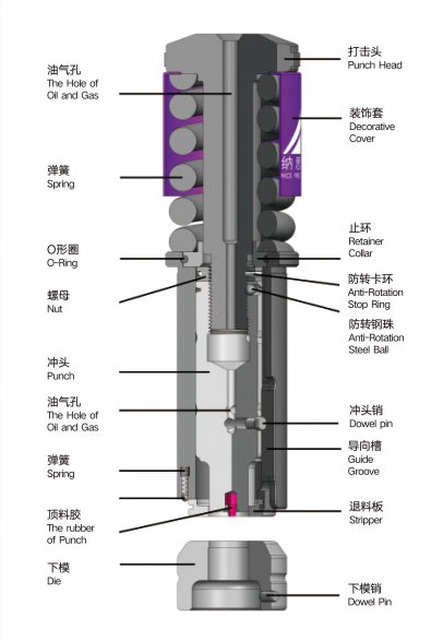 - 標準模具A、B工位的止環(huán)采用雙面錐度設計,可以雙面使用,增加沖頭刃磨量。