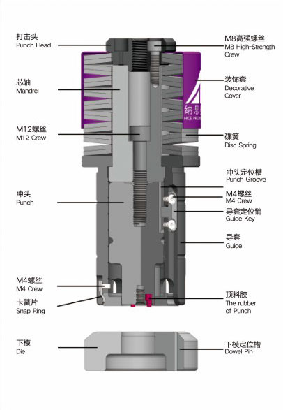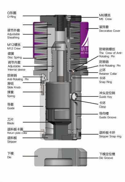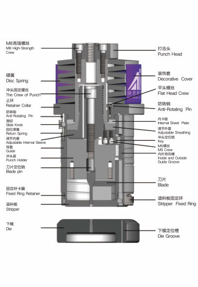 - 下模采用優(yōu)質(zhì)模具鋼,全部真空熱處理,刃口均為防帶料設計,有效防止廢料反彈、跳料、上浮發(fā)生。